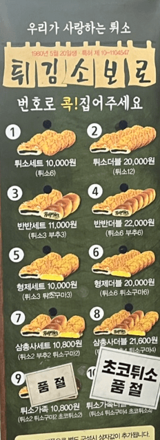 이곳 매대에서는 워낙 찾는 사람이 많다 보니 세트 형태로 판매하는 경우가 많습니다. 튀김소보로와 부추빵이 반반 들어 있는 세트가 가장 잘 팔리며, 번호만 말하면 직원분이 바로 포장과 결제를 해주기 때문에 속도감 있게 구매할 수 있습니다.
