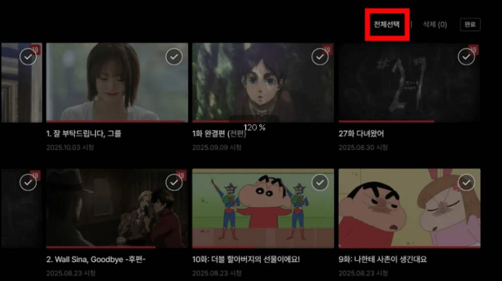 전체선택을 통해 시청기록을 한 번에 선택할 수도 있습니다.